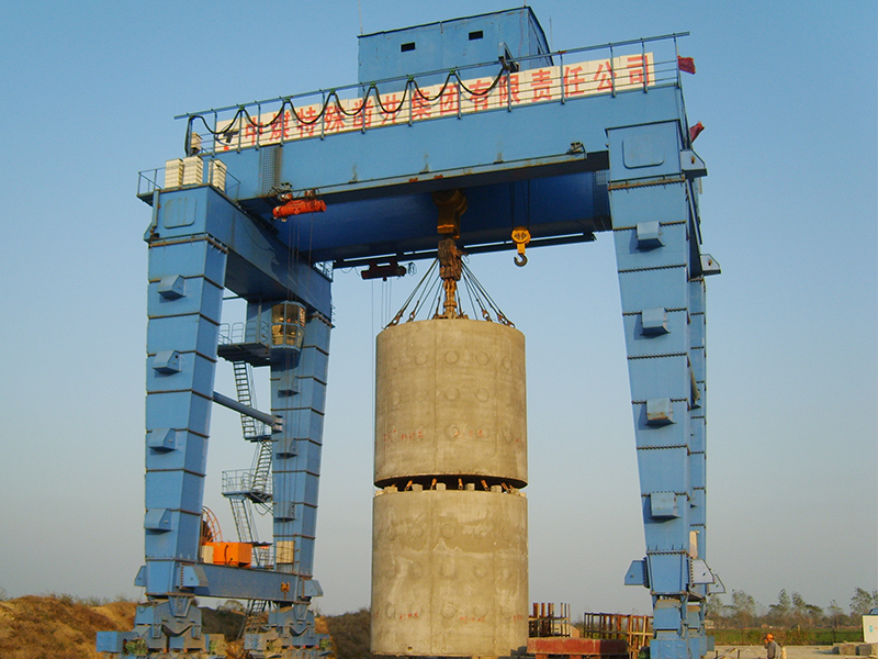自頂升門式起重機和U型門式起重機類似,門架結構為U型門機,區別在于支腿不同。由于特殊工作場合,大型起吊設備無法進場,自頂升門機支腿制作成幾段,每段支腿上都有千斤頂頂升支座。小車、主梁端梁組裝好后,采用千斤頂頂起,依次將每段支腿用法蘭連接到一起。之后安裝下橫梁、大車運行機構。