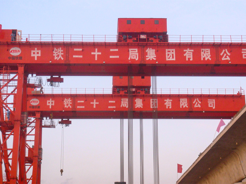 提梁機是一種為橋梁建設而專門設計的一種門式起重機。提梁機既可兩臺配合抬吊預制梁,也可以單臺起重機配雙吊具起吊預制梁,兩臺同時起重的提梁機各自的起重量一般為450噸,單臺起重的提梁機起重量通??蛇_900噸。它配置支腿行走、天車行走及天車起吊設備,可以實現全方位機械化動作。主要用于將預制梁從制梁臺提吊至存梁臺位,預制梁養護完成后將其從存梁臺位吊運到運梁車上。作為起重設備完成架橋機的組裝和拆卸。還用于架設墩身不高的旱橋。
